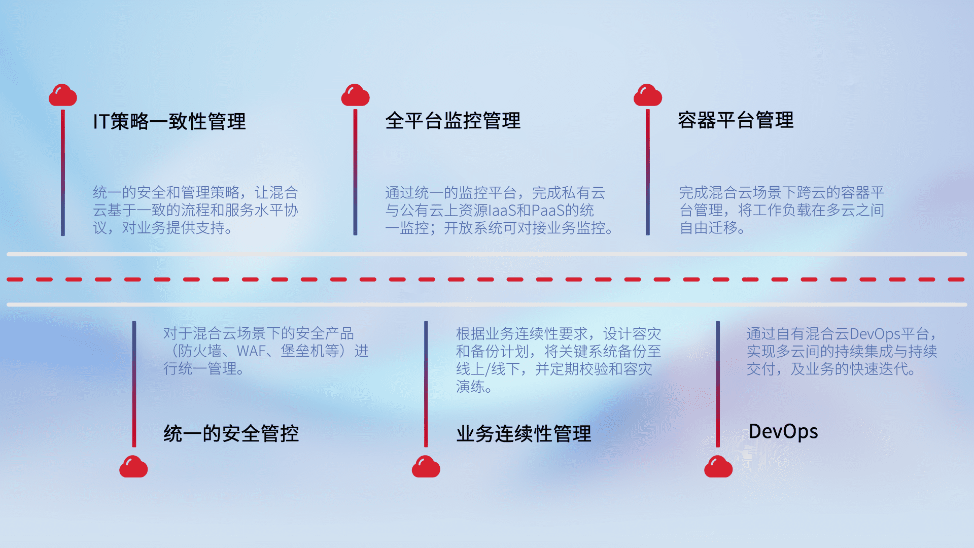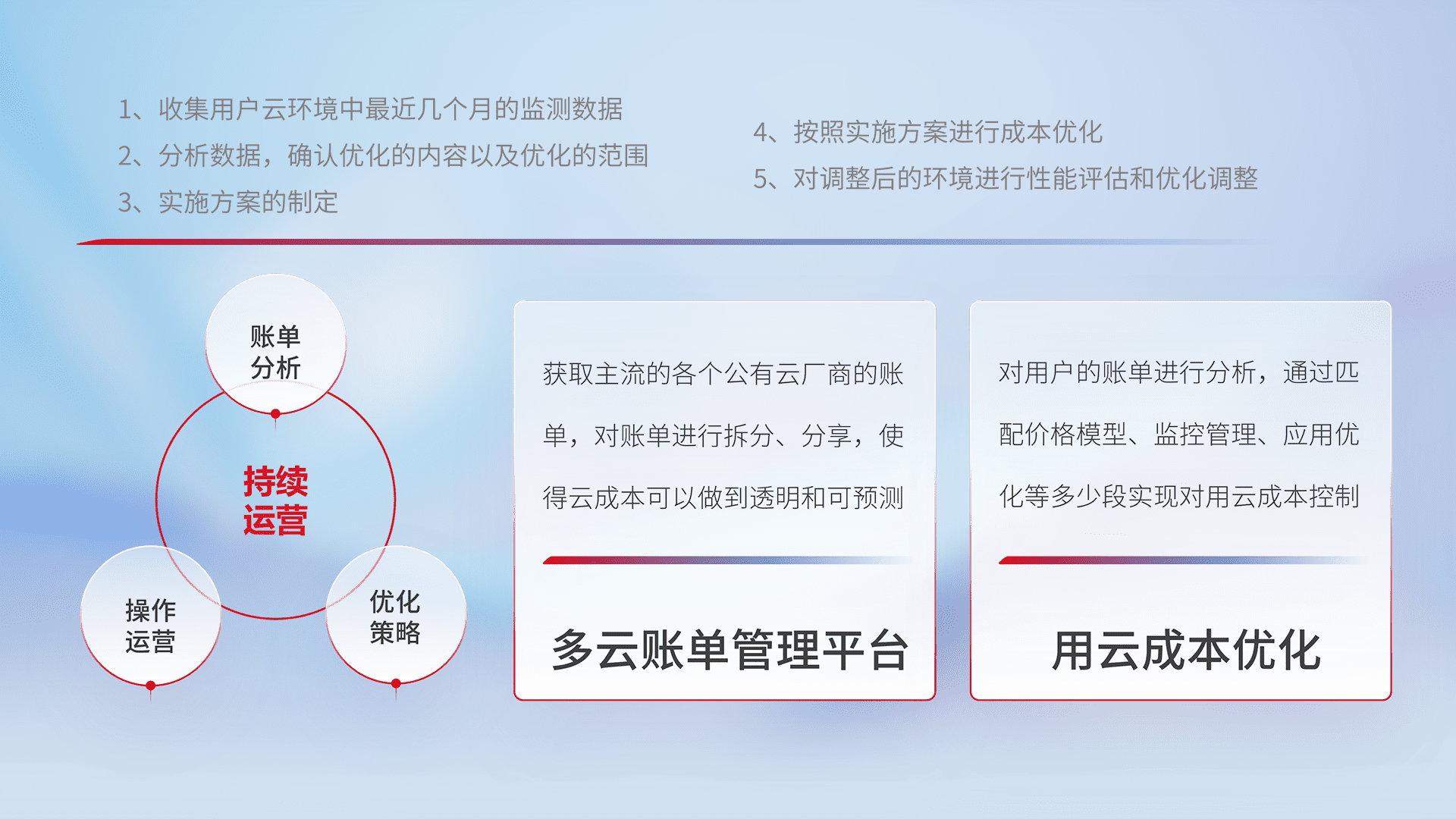 通过多云纳管,,以统一的资源数据模型把客户的云资源进行抽象和封装,,进而实现对多云资源的统一操作,,,,保障云资源管理的可靠性、、、、稳定性与可用性。。。。量身定制化运维内容,,配置、、、开发运维、、、补丁管理、、、、备份、、监控、、、认证和访问管理、、审计和日常巡检等,,,保障在用云过程中的可靠度,,,,稳定度以及高可用率。。。